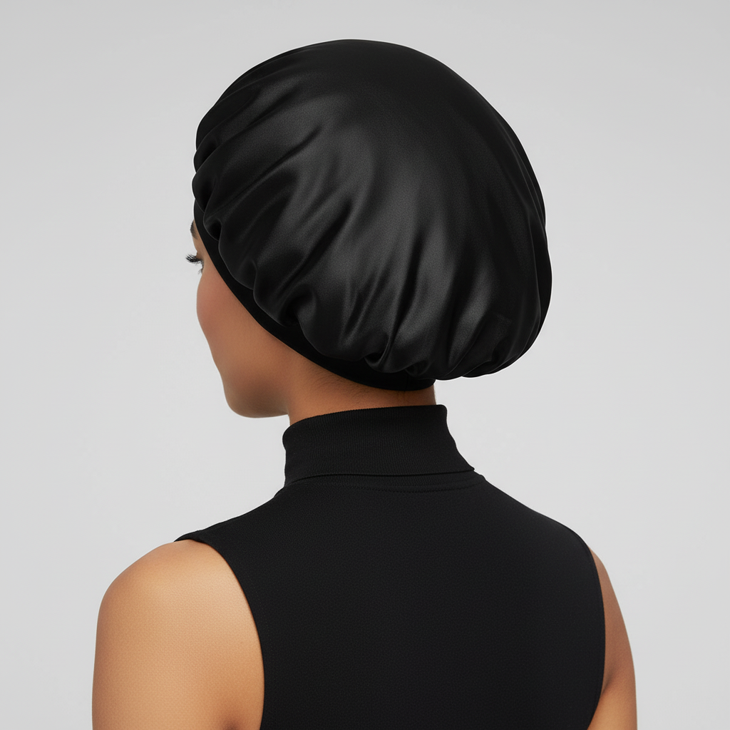 Ce bonnet en satin noir est conçu pour couvrir l'ensemble de la chevelure. Sa surface lisse est destinée à minimiser le frottement capillaire avec les surfaces externes, comme les oreillers ou les textiles. Une bande élastique intégrée assure son maintien sur la tête.