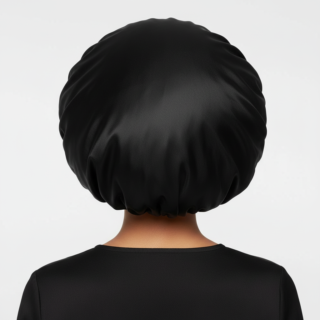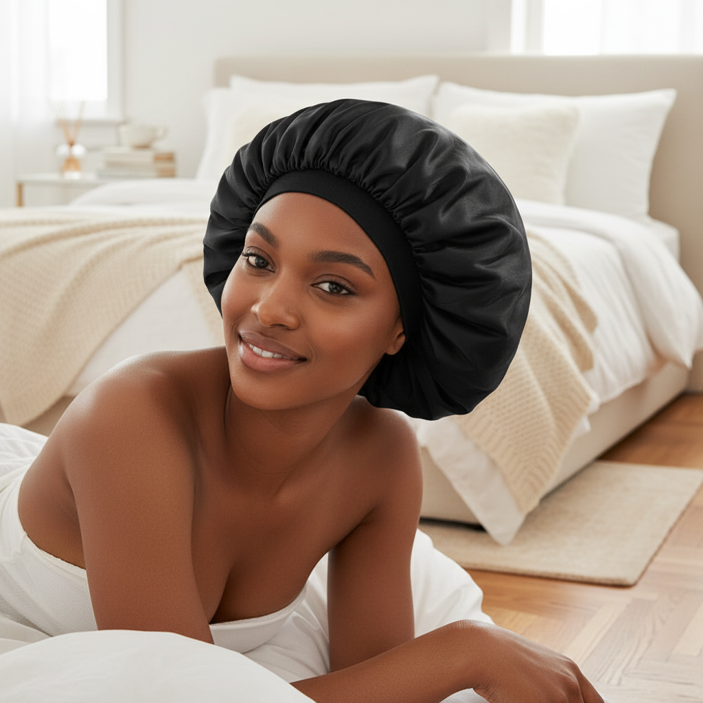 Protégez vos cheveux toute la nuit avec notre bonnet en satin noir élastique.