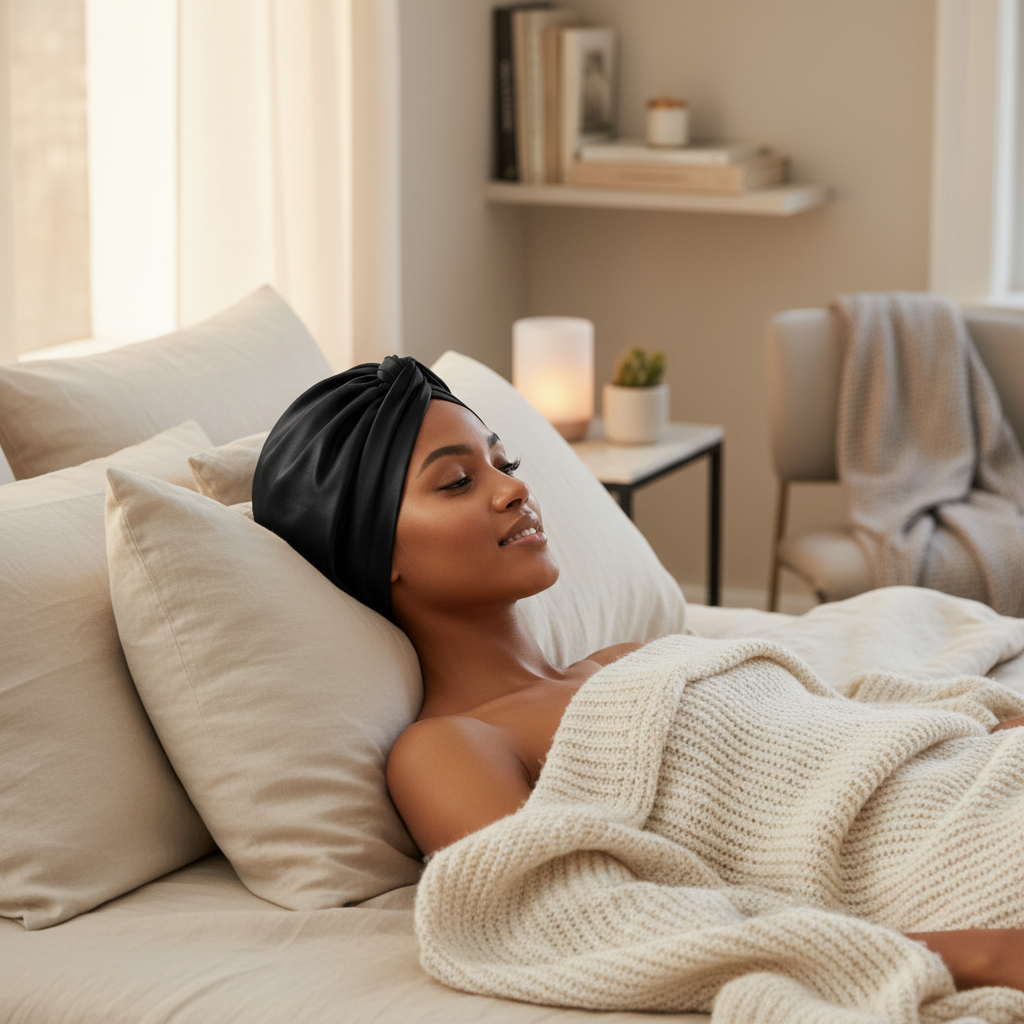 Bonnet En Satin Noir Noué Nuit : Turban de Protection Capillaire