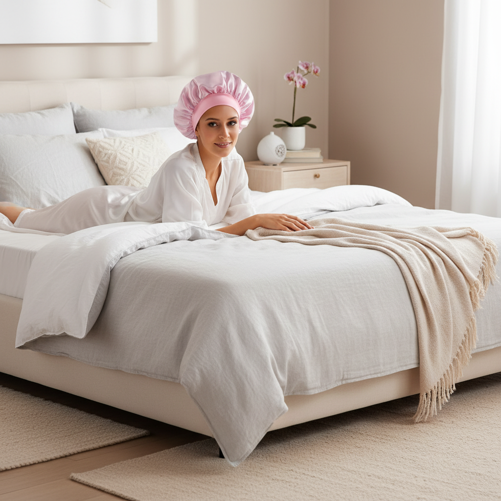 Protégez vos cheveux toute la nuit avec notre bonnet en satin pêche, conçu pour un soin optimal.