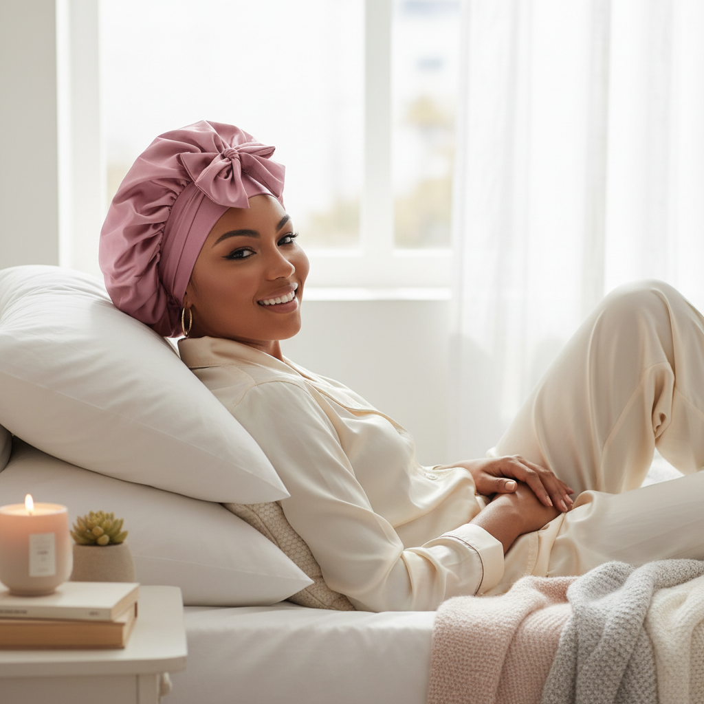 Protégez vos cheveux pendant la nuit avec notre élégant bonnet en satin rose à volants.