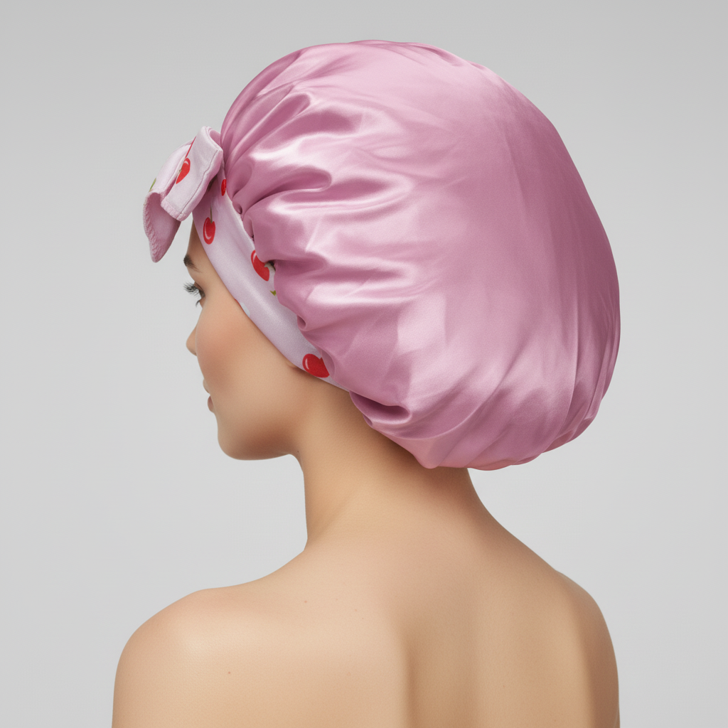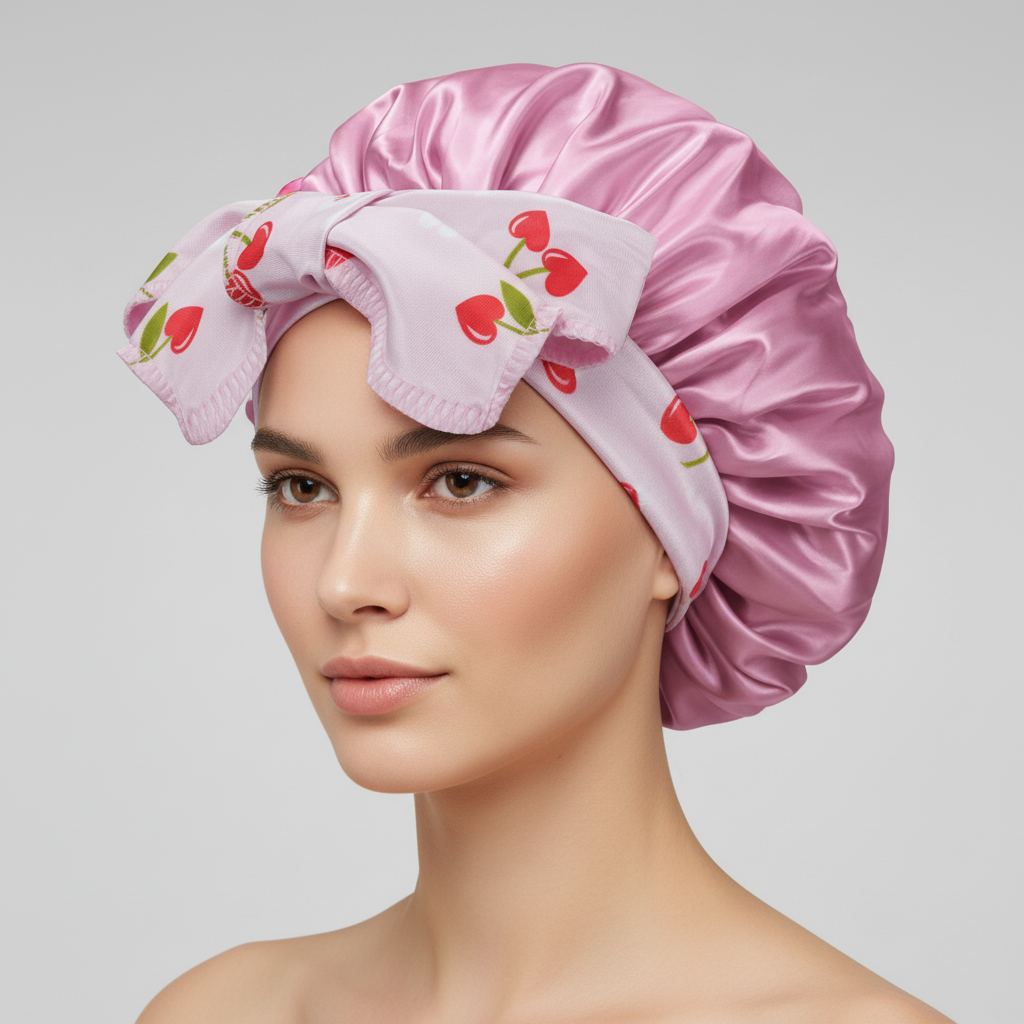 Ce bonnet de nuit en satin est conçu pour couvrir les cheveux des enfants pendant le sommeil. Il est doté d'un élastique intégré pour l'ajustement et d'un bandeau décoratif à motif de cerises.