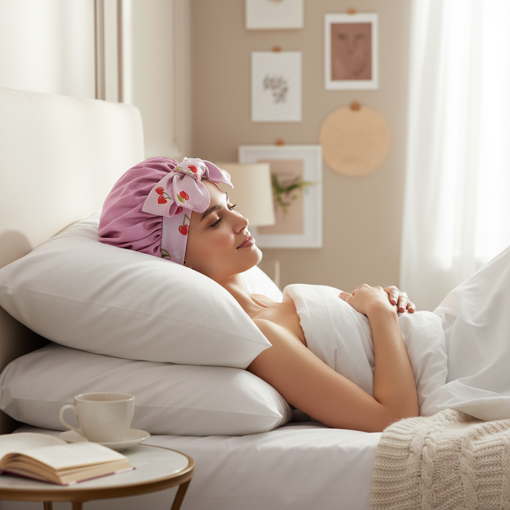Le bonnet en satin est utilisé pour envelopper les cheveux durant le sommeil. Sa surface lisse a pour objectif de réduire les frictions entre les cheveux et les tissus de literie. L'élastique maintient le bonnet en place sur la tête.