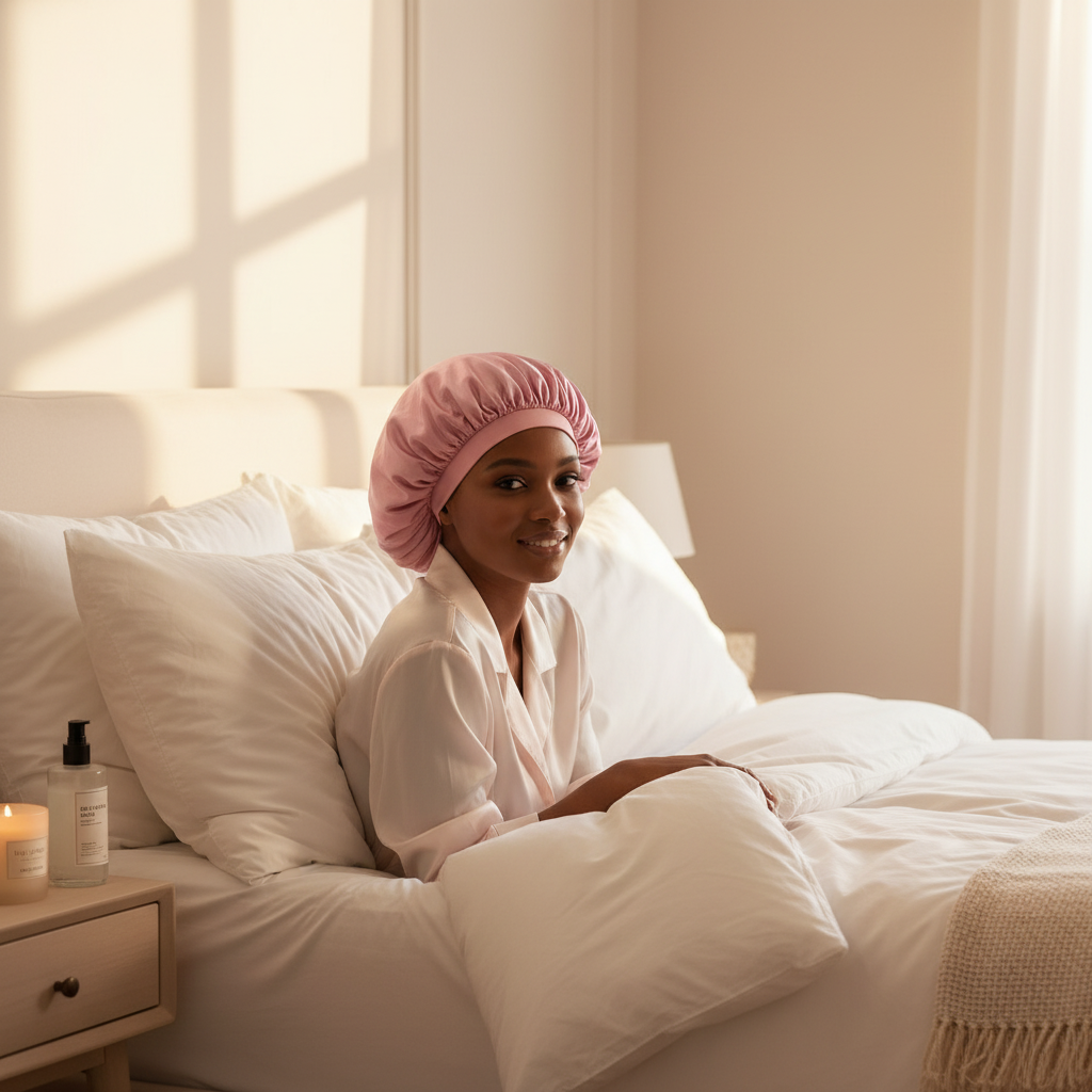 Le tissu satiné offre une surface lisse qui minimise les frictions mécaniques sur la fibre capillaire. Ce bonnet permet de maintenir la coiffure en place et de limiter le contact direct des cheveux avec les surfaces de literie.