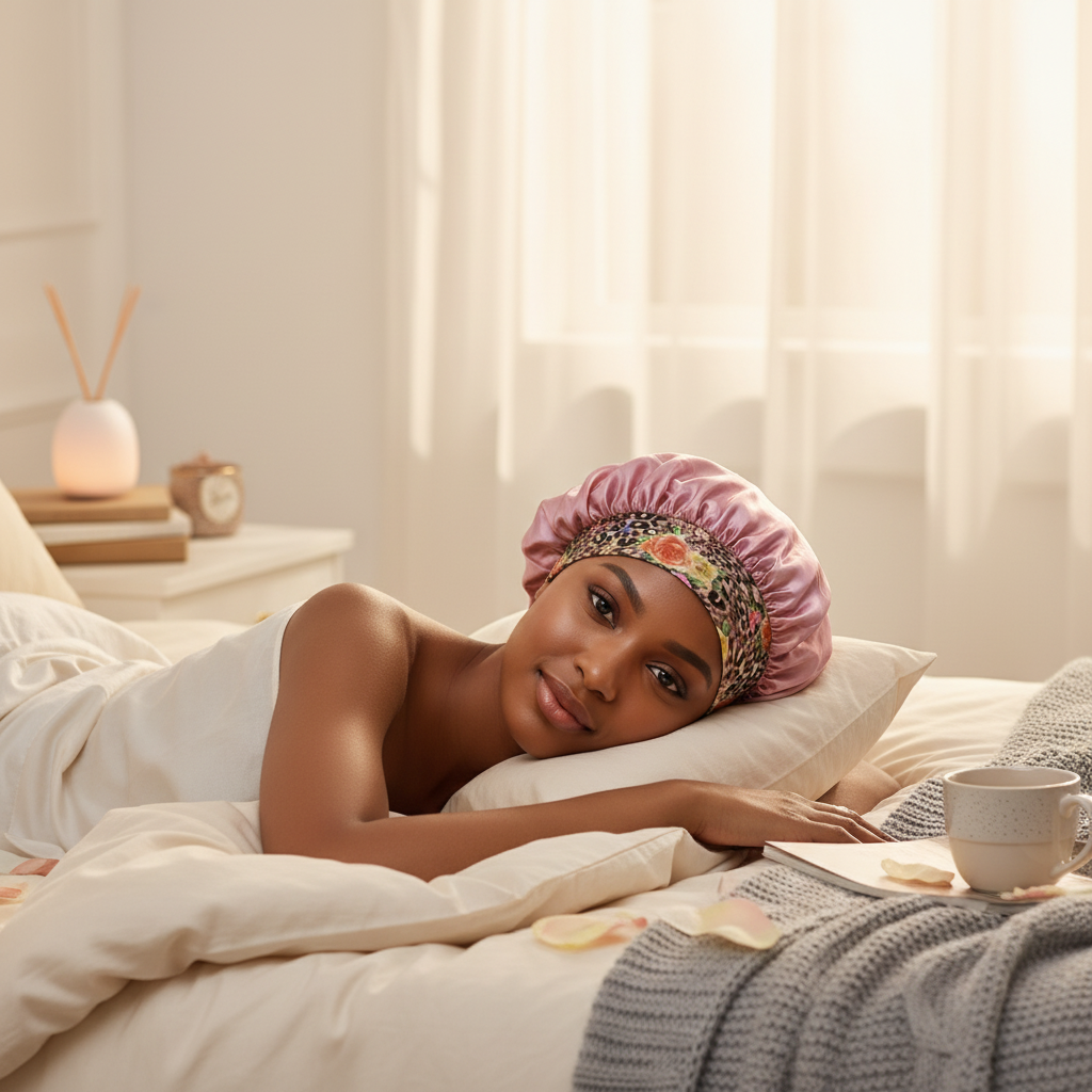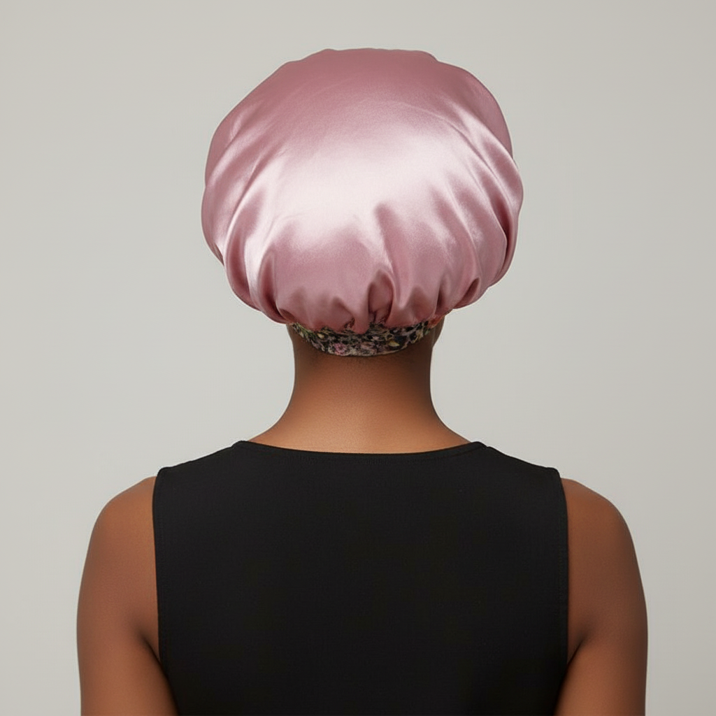 Protégez vos cheveux avec élégance grâce à notre bonnet en satin rose imprimé.