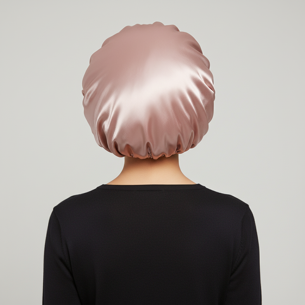 Ce bonnet en satin est un accessoire conçu pour la protection des cheveux durant la nuit. Il intègre un système d'ajustement pour s'adapter à différentes tailles de tête et volumes capillaires.