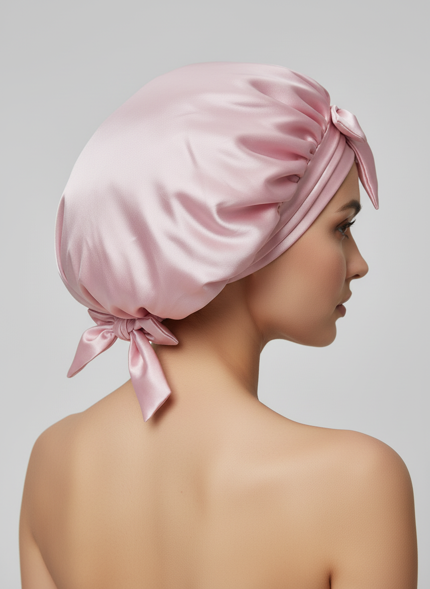 Protégez vos cheveux pendant votre sommeil avec ce bonnet en satin rose doux et élégant, conçu pour un soin capillaire optimal.