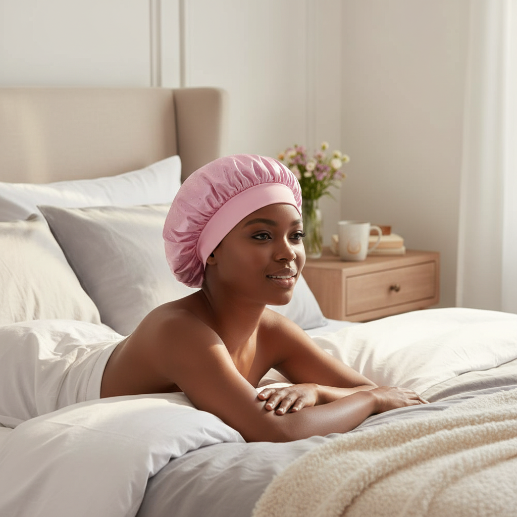 Protégez vos cheveux avec élégance grâce à notre bonnet en satin rose.