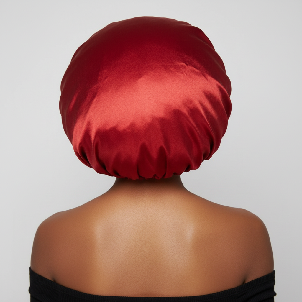 Ce bonnet en satin est conçu pour envelopper la chevelure durant le sommeil ou lors de soins. Il vise à réduire la friction des cheveux contre les surfaces, aidant ainsi à maintenir leur hydratation et leur structure.