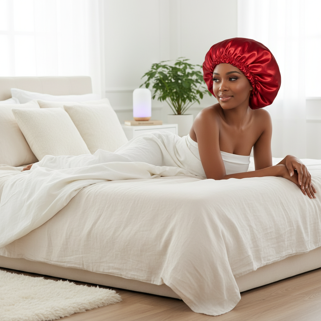 Protégez vos cheveux avec élégance chaque nuit grâce à notre bonnet en satin rose vif.