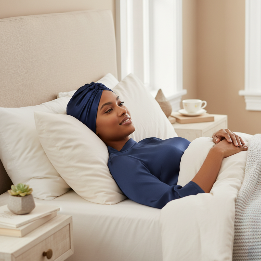 - Compatibilités / Conditions d’usage : Conçu pour être porté sur la tête afin de couvrir les cheveux. Peut être utilisé pendant le sommeil ou lors de routines de soin. Convient à la plupart des volumes de cheveux. La nature du satin, par sa surface lisse, génère moins de frottement sur les cheveux que d'autres textiles.