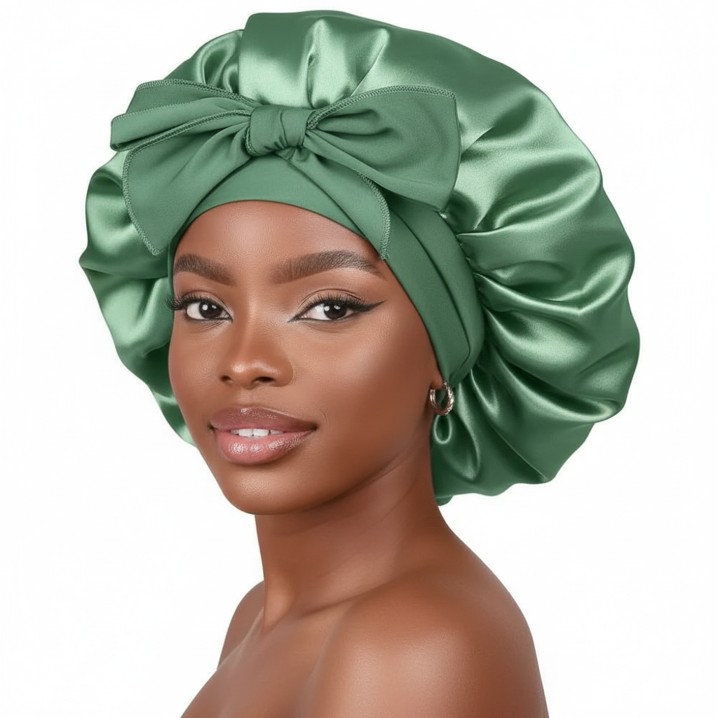 Un bonnet de nuit en satin de couleur verte, doté d'un nœud décoratif. Il est conçu pour couvrir les cheveux et réduire les frottements durant le sommeil.