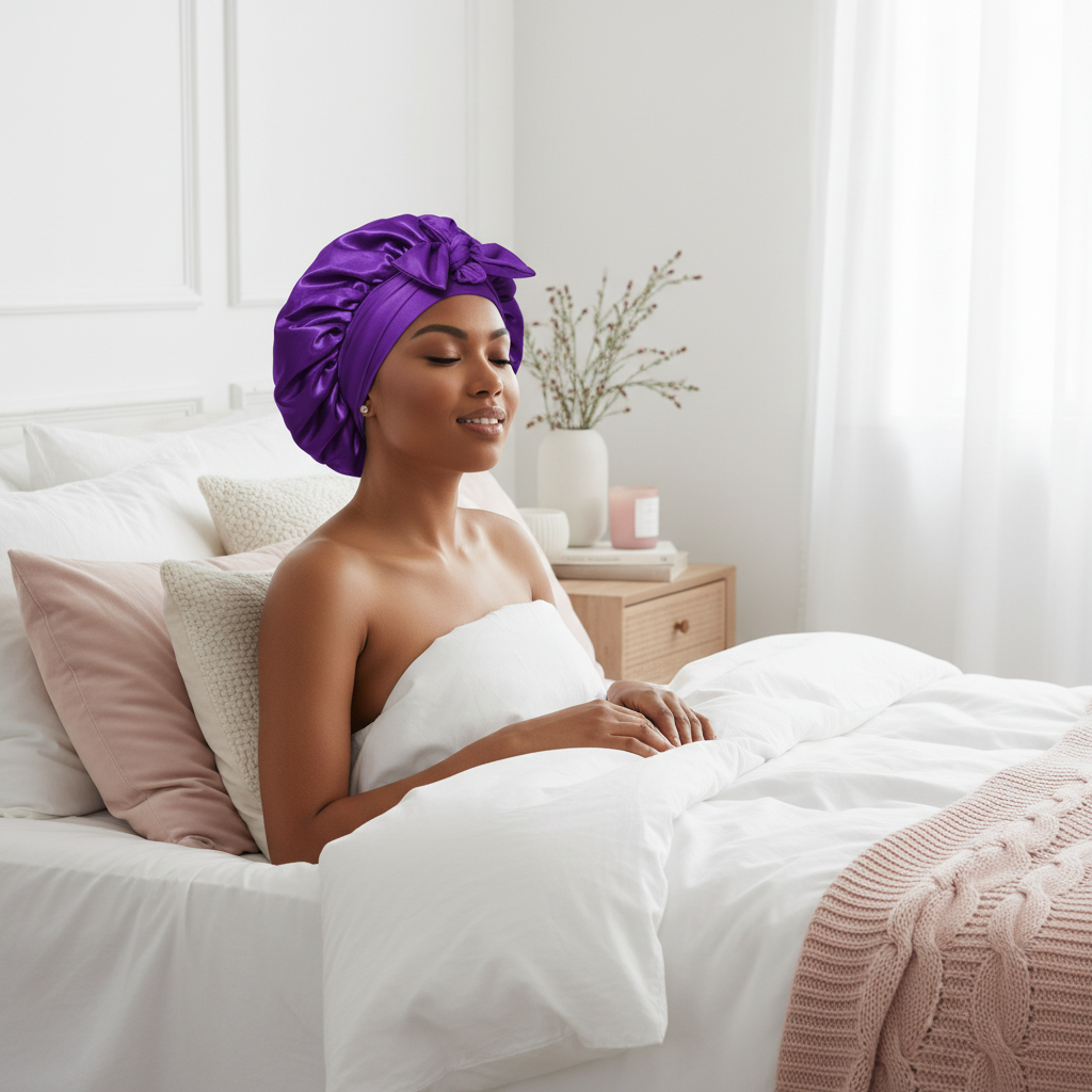 Protégez vos cheveux avec élégance grâce à notre bonnet en satin violet, parfait pour préserver votre coiffure toute la nuit.