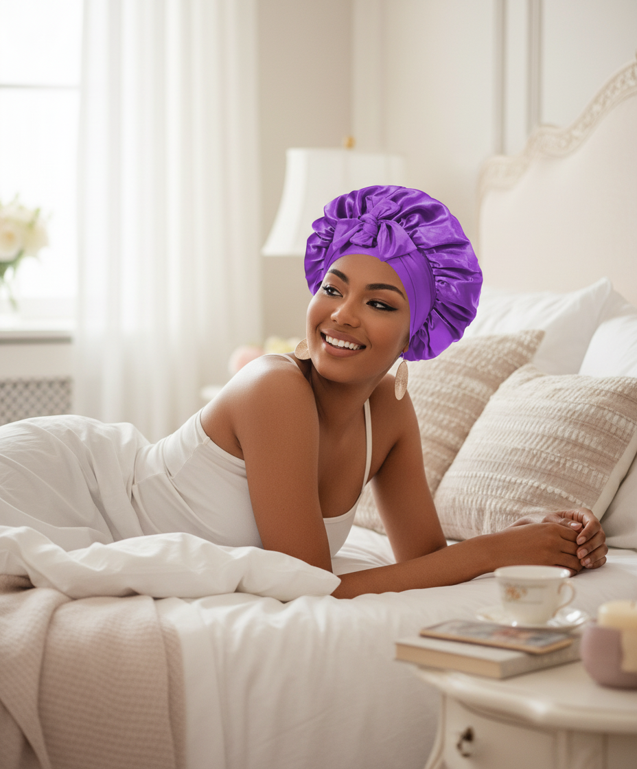 Protégez vos cheveux avec style et confort grâce à notre bonnet en satin violet, conçu pour un usage quotidien.