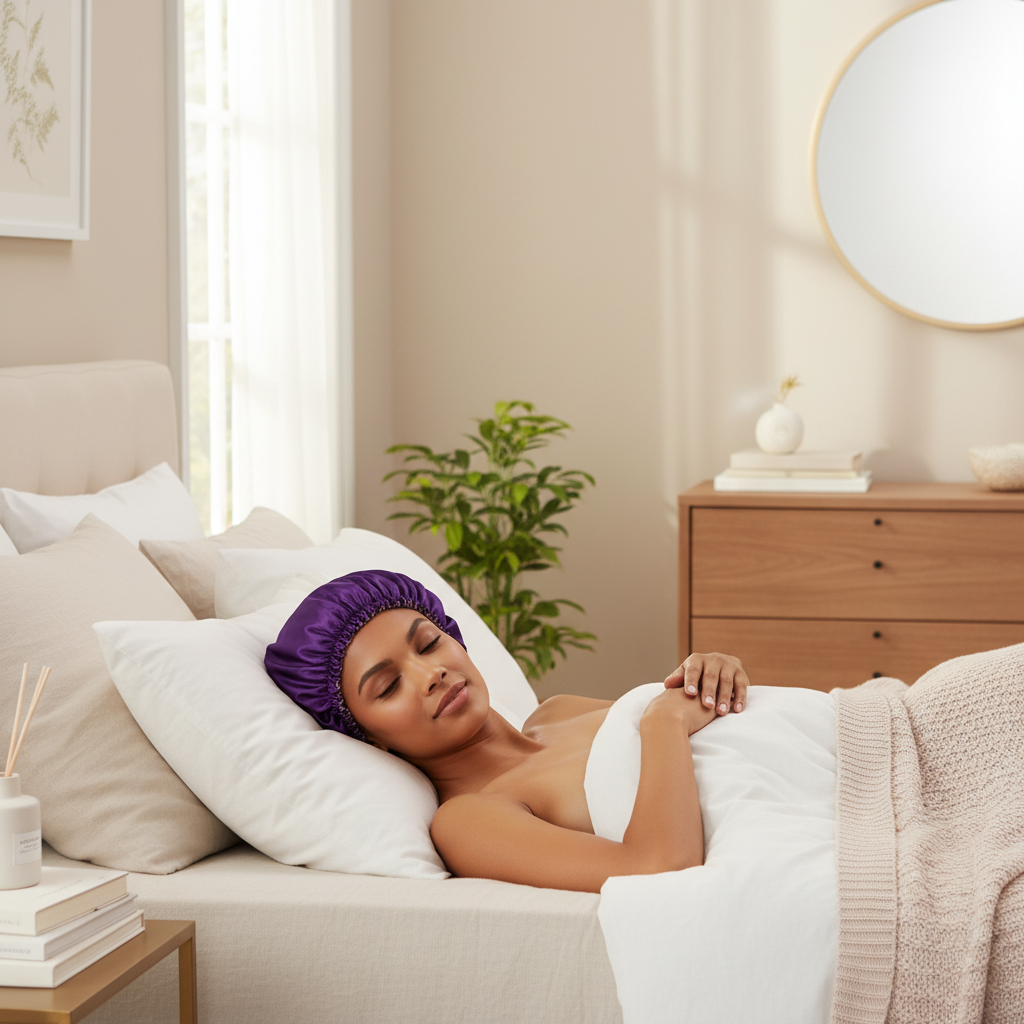 Le bonnet en satin est utilisé pour couvrir les cheveux pendant la nuit. Sa surface lisse contribue à réduire la friction des cheveux contre les surfaces de couchage, et il aide à maintenir la coiffure. La bande élastique assure le maintien du bonnet sur la tête durant l'usage.