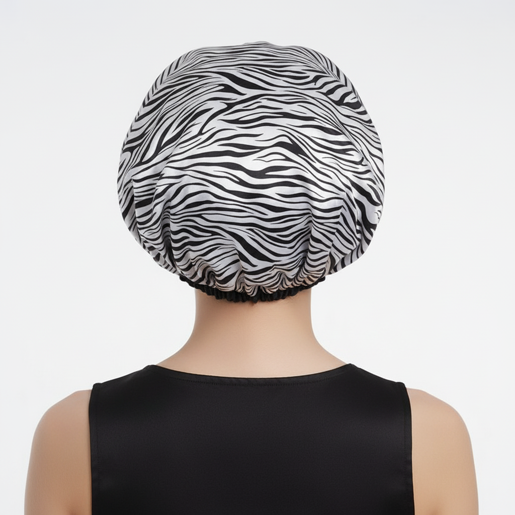 Le Bonnet En Satin Zèbre Pour La Nuit est un accessoire capillaire conçu pour être porté pendant le sommeil. Il offre une couche protectrice aux cheveux.